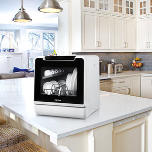 Mesurant seulement 42,8 cm x 42,5 cm x 45,8 cm (L/l/H), l'empreinte compacte de ce lave-vaisselle de comptoir D1 permet de le placer facilement dans des espaces restreints. L'intérieur spacieux, avec un panier à vaisselle spécialement conçu et un panier à couverts, peut accueillir plus de 30 pièces de vaisselle à la fois, y compris 4 bols, 4 tasses, 8 assiettes (jusqu'à 27,5 cm de diamètre) et 7 sets de couverts.