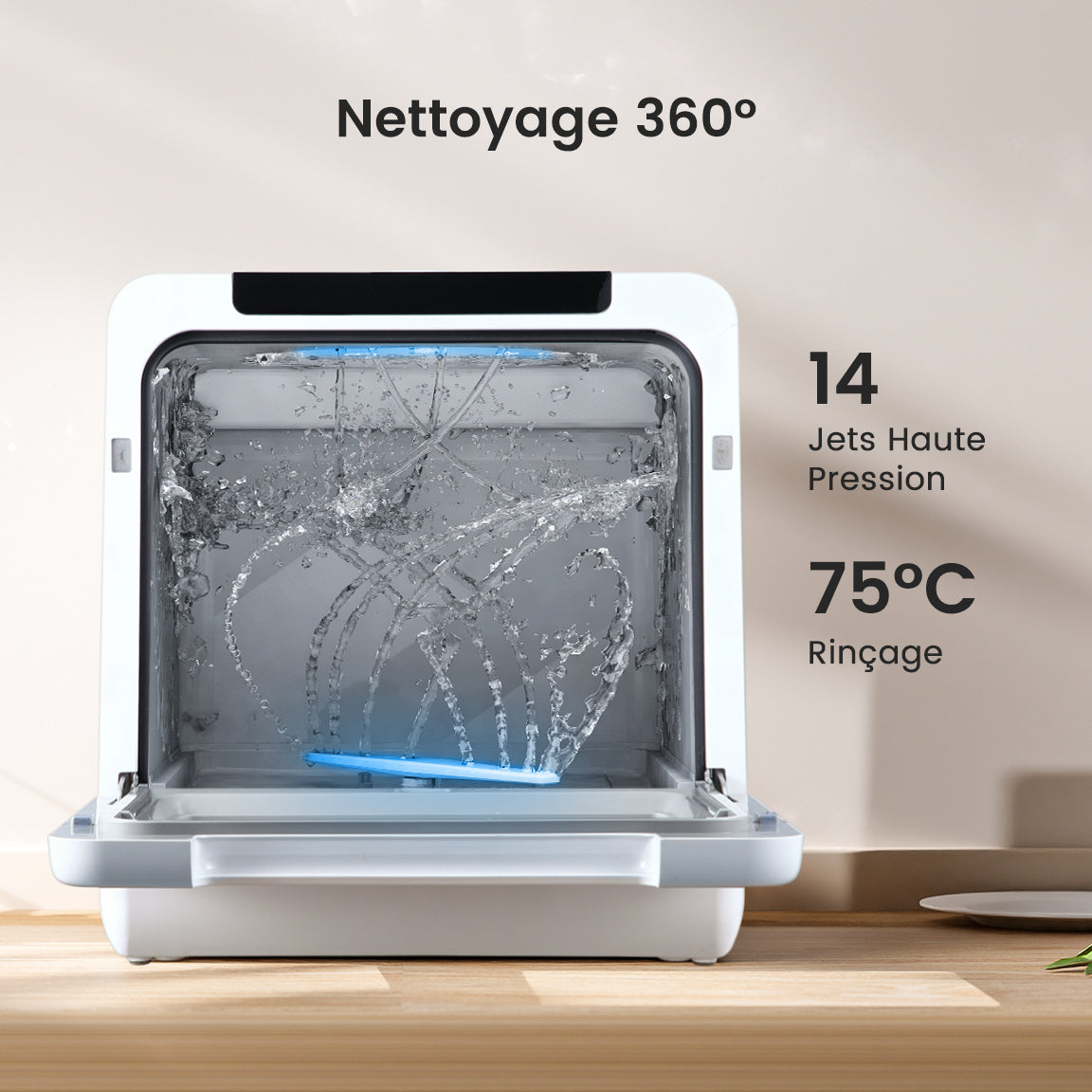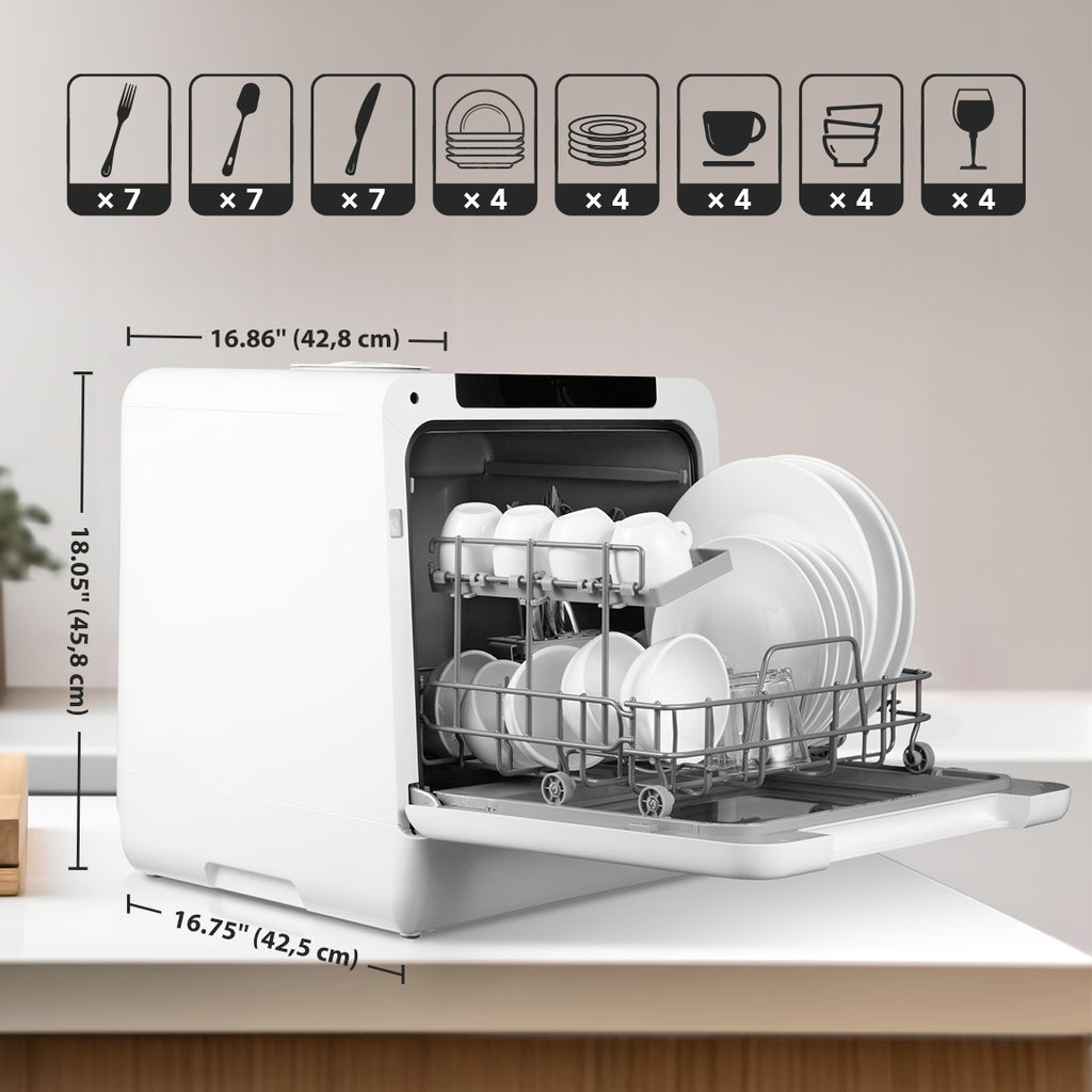 Mesurant 42,8 cm x 42,5 cm x 45,8 cm (L/l/H), ce lave-vaisselle de comptoir compact peut être facilement placé dans des espaces restreints. Son intérieur spacieux peut contenir plus de 30 pièces de vaisselle, y compris 4 bols, 4 tasses, 8 assiettes (jusqu'à 27,5 cm) et 7 sets de couverts.