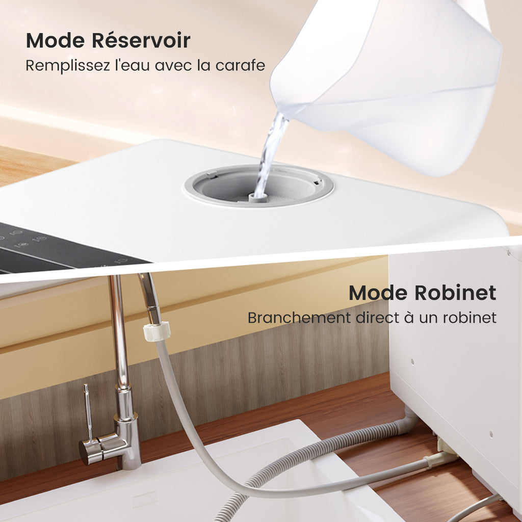 Vous pouvez utiliser le tuyau d'entrée d'eau pour le connecter au robinet pour l'approvisionnement en eau, ou simplement remplir le lave-vaisselle en versant de l'eau dans le réservoir intégré de 5 L. Grâce au tuyau de drainage prolongé, l'eau peut être évacuée dans un évier, un seau ou tout autre endroit adapté.